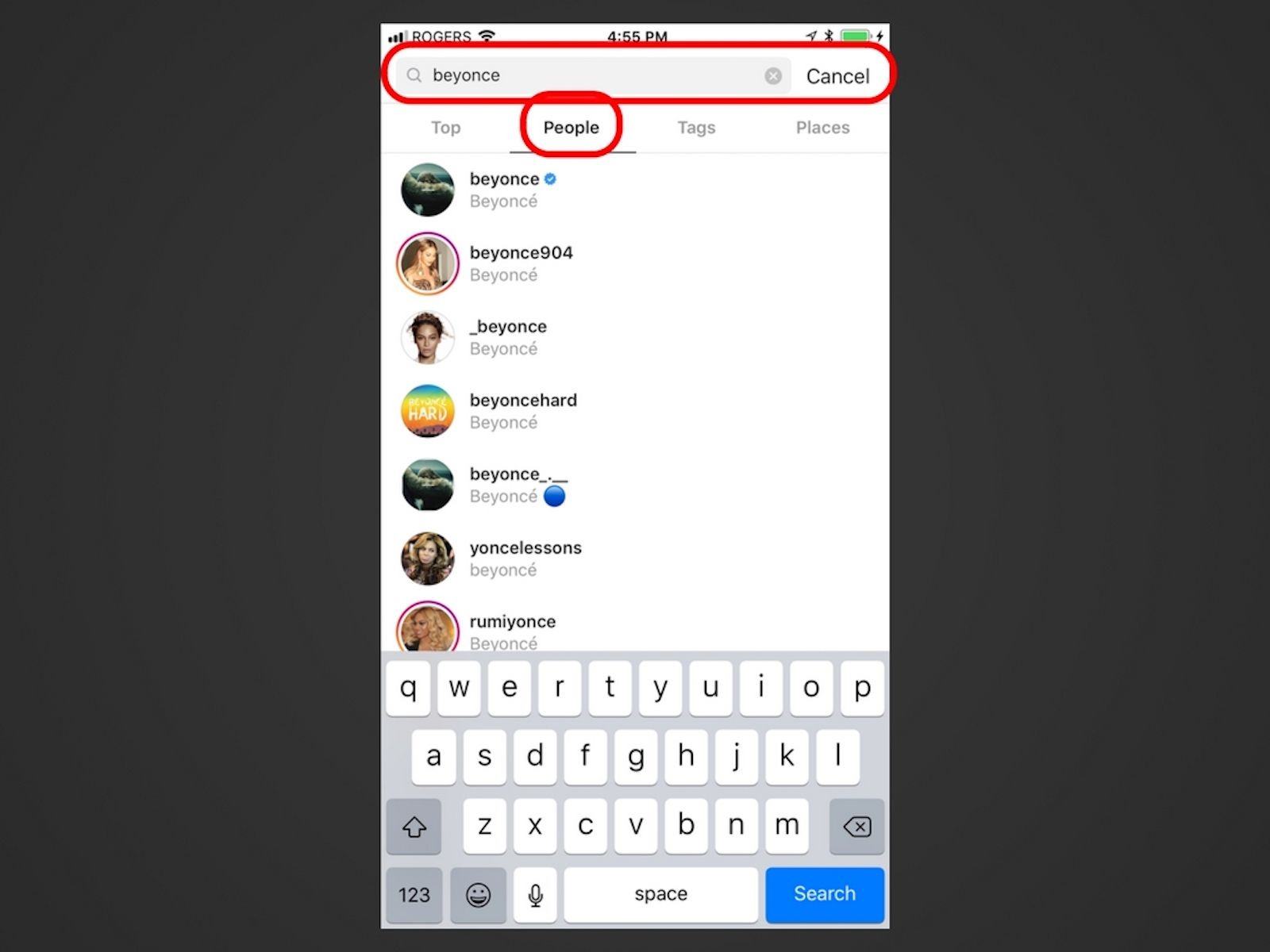 When you tap on the search icon and type a letter or keyword, Instagram